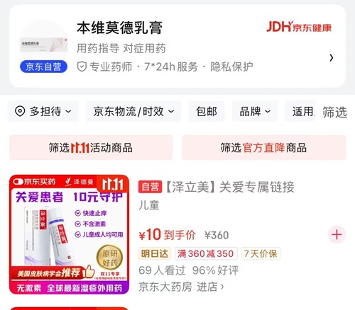 10月27日,正值京东11.11,创新药品牌泽德曼医药与京东大药房开启深度合作,消费者通过京东APP搜索“泽立美本维莫德乳膏关爱专属”,即可参与双方发起的“关爱患者 10元守护”专项关爱行动,特定区域的轻中度特应性皮炎患者通过领取350元优惠劵,实际仅需支付10元,即可获得一支创新药“泽立美乳膏”。该活动旨在通过严谨合规的药品供应路径,为特定区域患者提供接触创新治疗方案的机会。