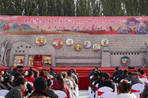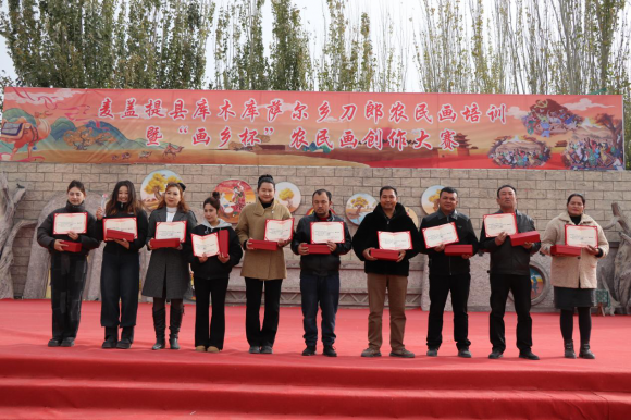 为深入学习贯彻习近平新时代中国特色社会主义思想,全面落实新时代党的治疆方略,特别是习近平总书记关于文化润疆的重要指示精神,11月8日上午,麦盖提县库木库萨尔乡“画乡杯”农民画创作大赛颁奖仪式在刀郎画乡旅游景区举行。此次大赛通过农民画家的独特视角,生动展现新疆维吾尔自治区成立70年来的辉煌成就与乡村巨变,为文化润疆工作注入了鲜活的乡土力量。