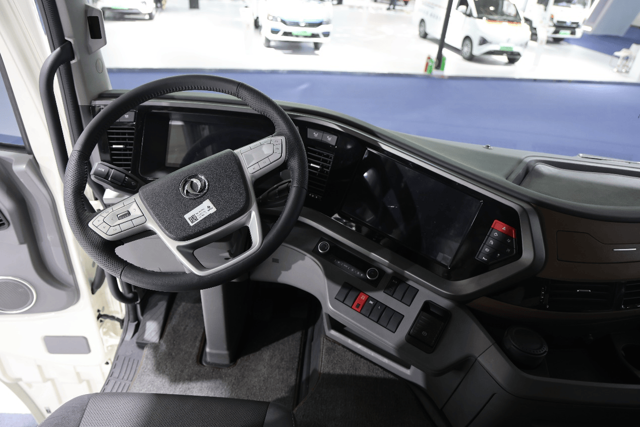 驾驶室内是东风打造的智能座舱,液晶仪表+液晶大屏,方向盘采用多功能样式,工作台环绕造型,还有自动空调、电子手刹、怀挡换挡等配置。为了符合欧洲人的使用喜欢,东风天龙GX还可以选配酒精锁、盲区提示器等配置。