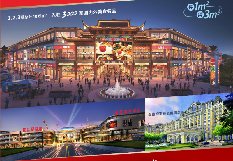 八卦美食城的1、2、3期总计40万㎡,入驻3000家国内外美食名品环球国际贸易城:建设中亚、南亚与新疆相关贸易的国际贸易城,总计40万㎡温德姆至尊豪庭酒店:国际连锁五星级酒店,含1000间客房,3000人宴会厅。